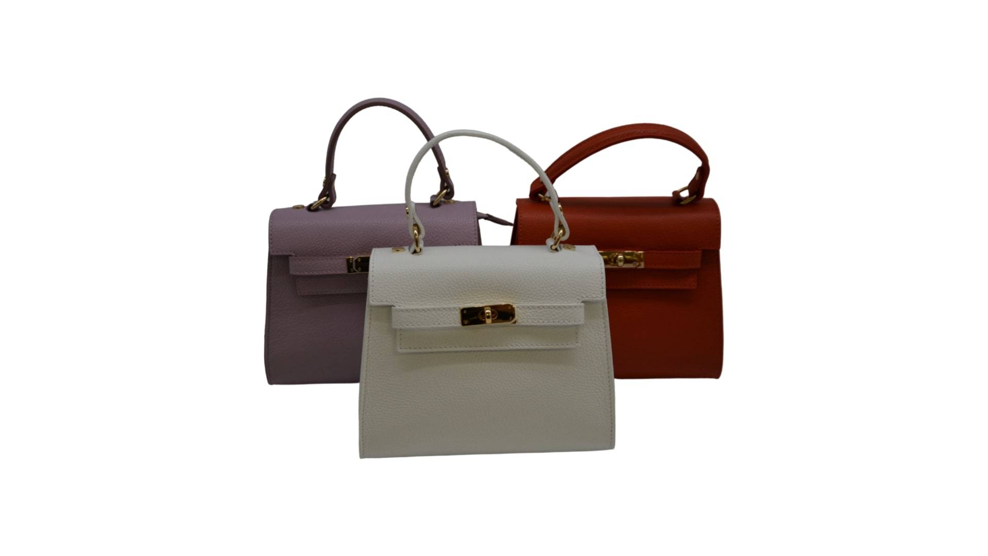 Tragegriff aus Leder auf Überwurfpatte, Drehhverschluss, innen mittig RV, innen seitl. RV-Tasche,Umhängegurt (Leder), einhängbar, Acc. gold