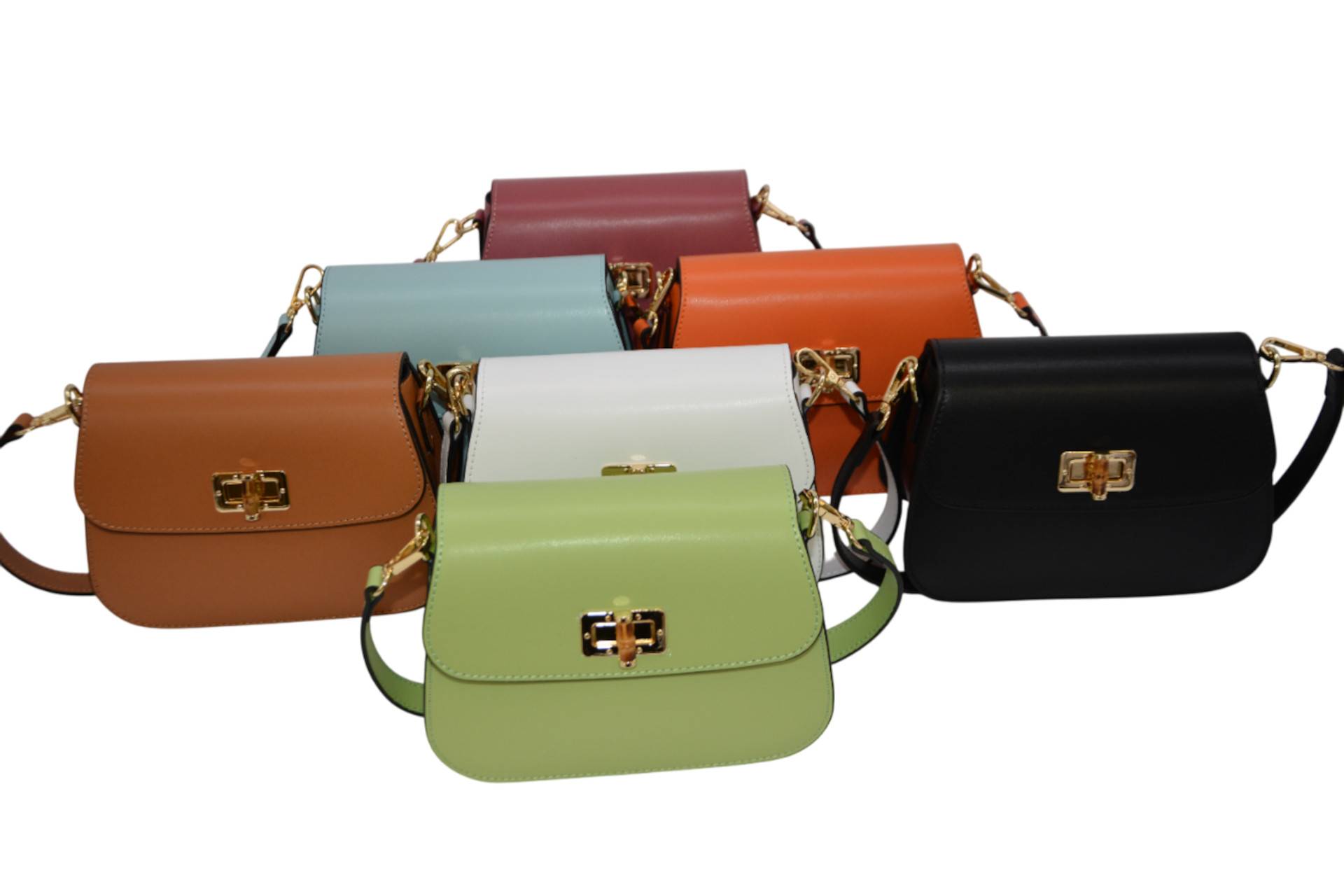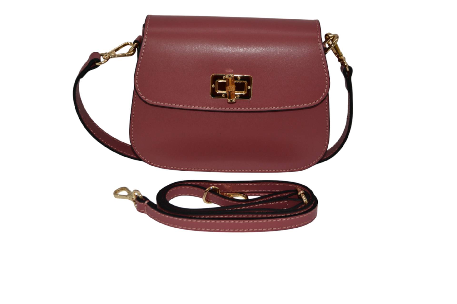 kurzer Tragegurt (Leder) einhängbar, Überwurfpatte, einnen seitl. Einschubtasche, Umhängegurt (Leder) einhängbar, Acc. gold