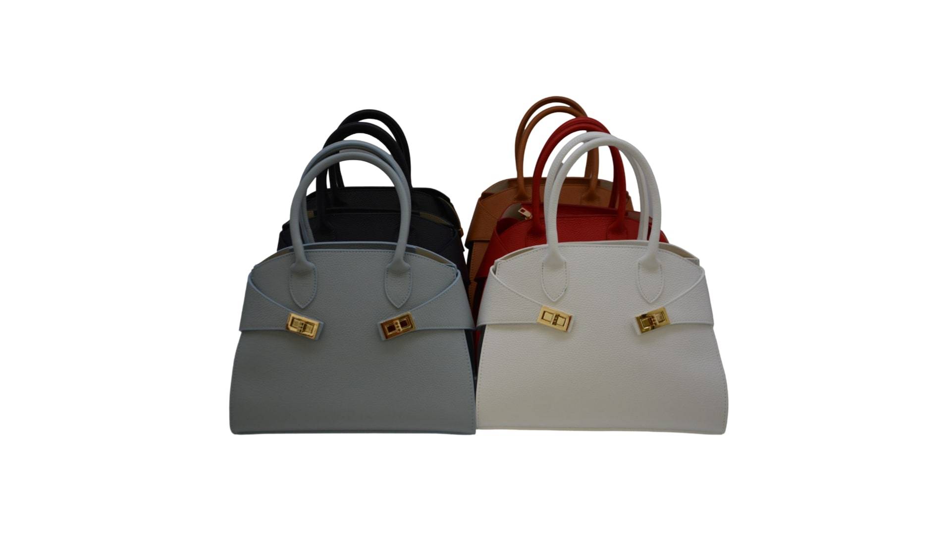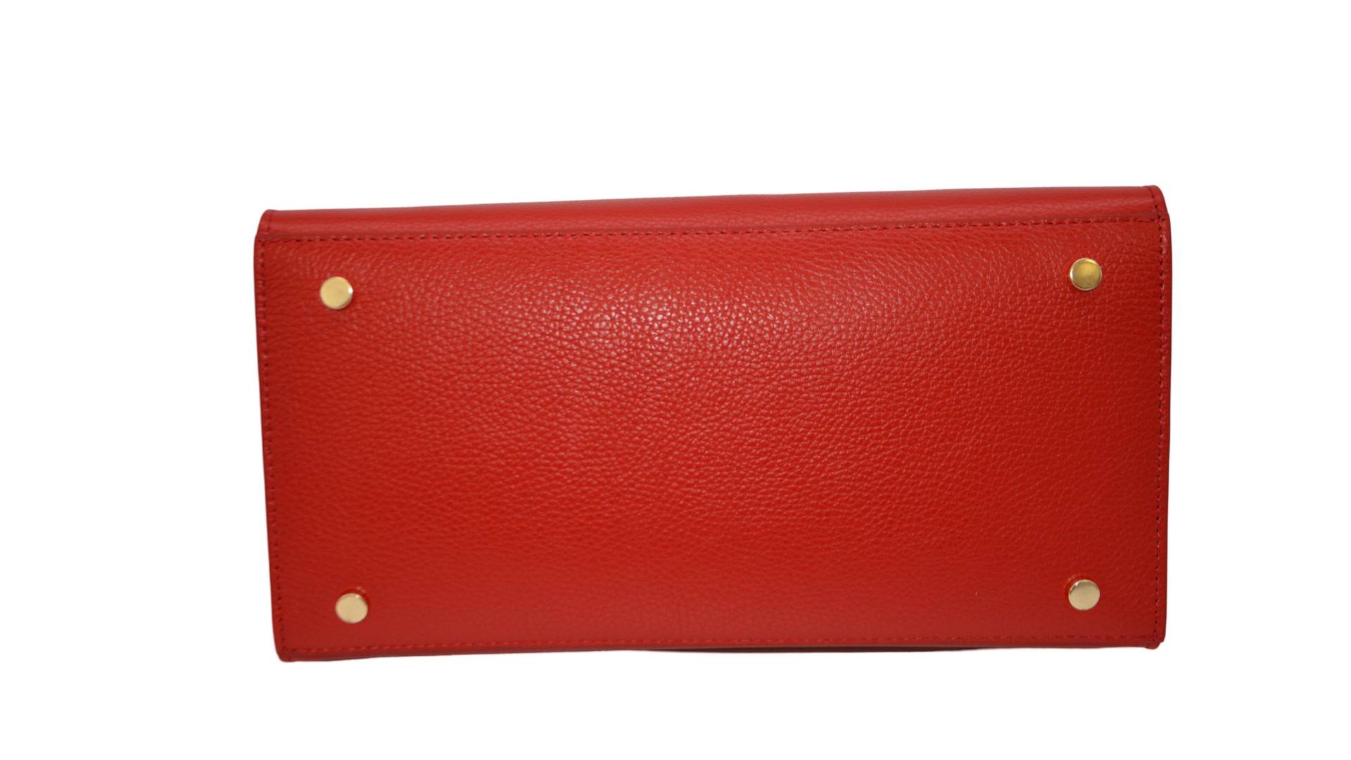 2 Tragegriffe aus Leder, mittig RV, innen mittig Taschenbeutel zum Einhängen, von aussen 2 seitliche Verschlussbänder, Umhängegurt (Leder) einhängbar, Acc. gold