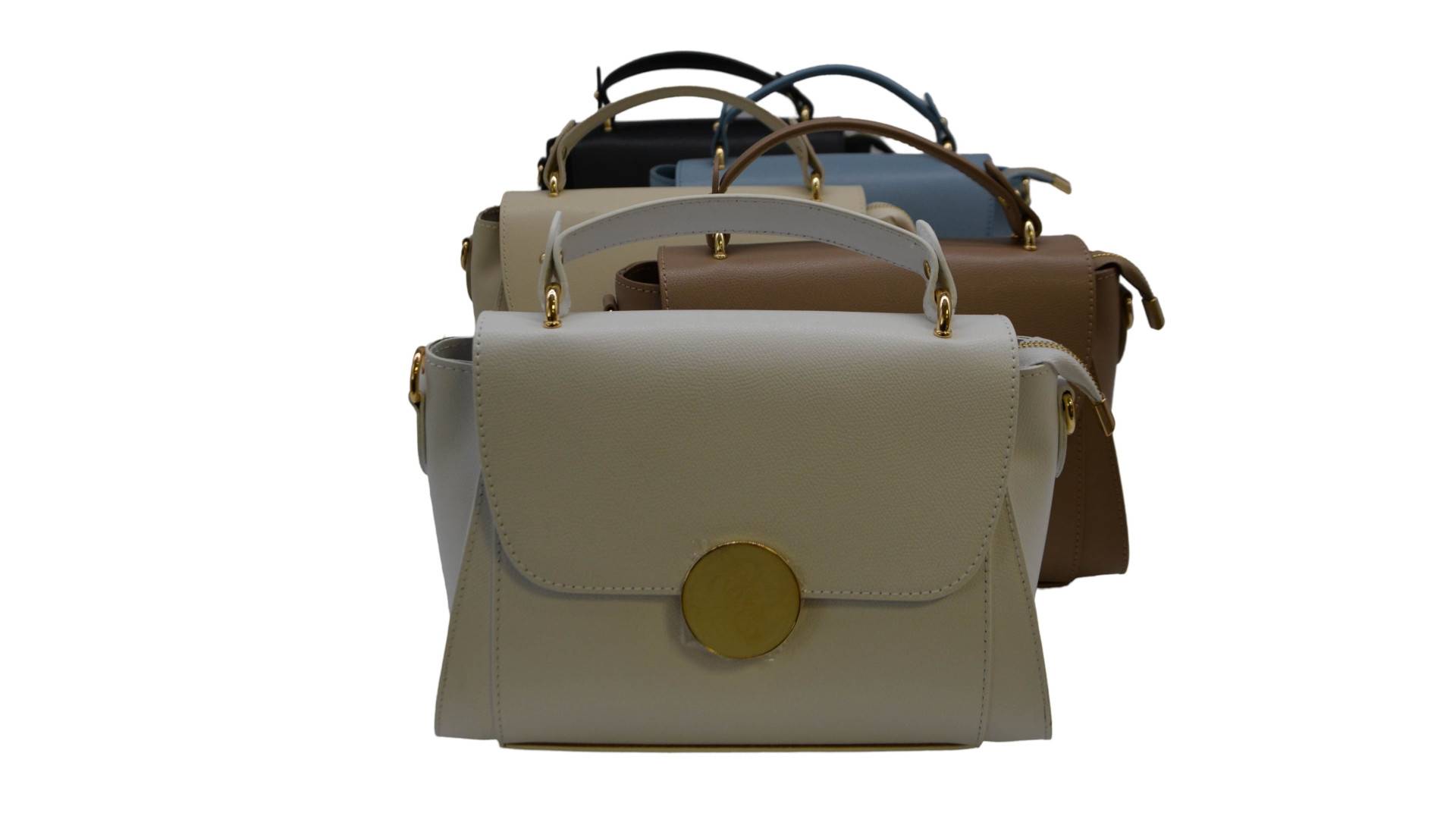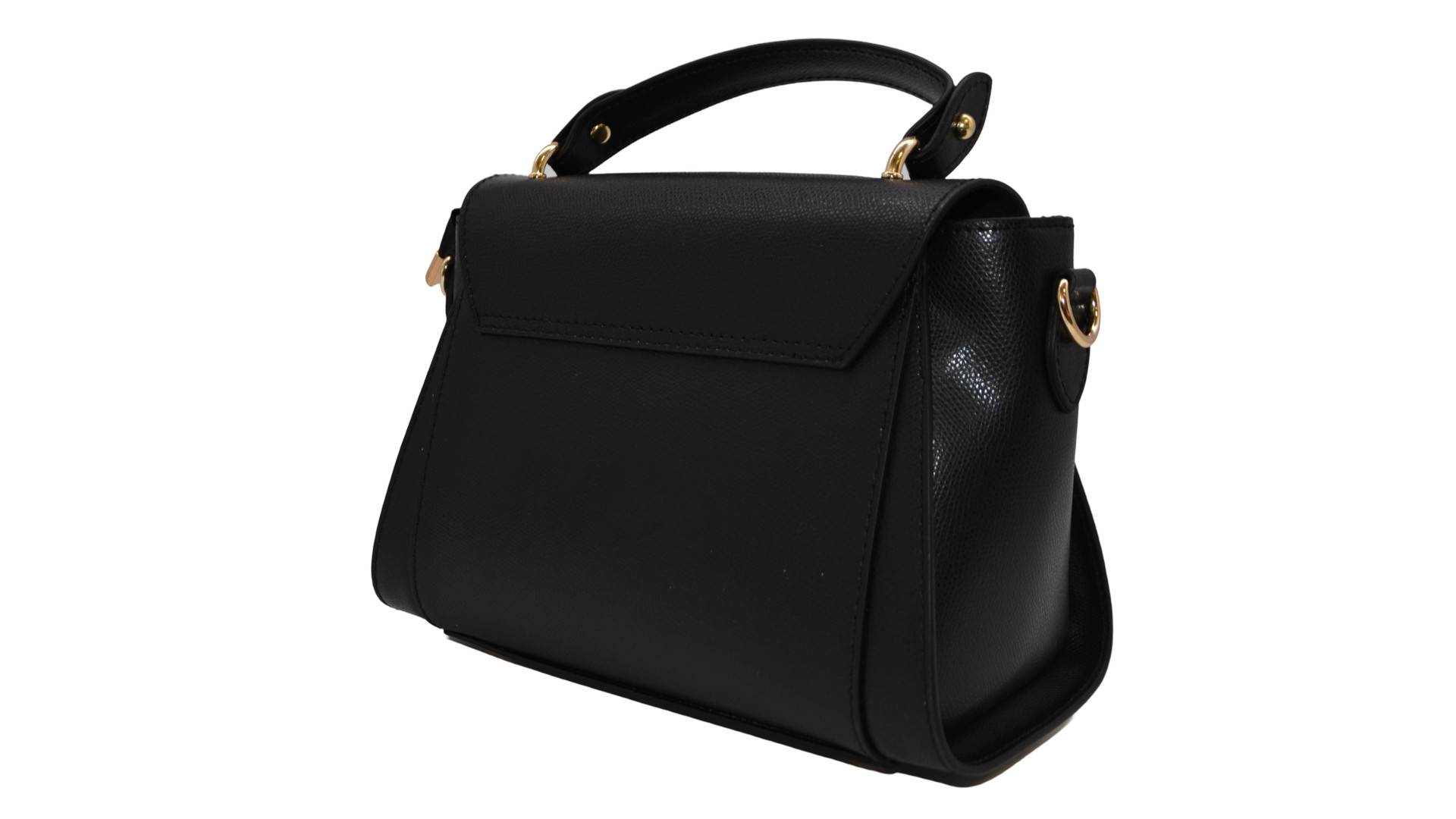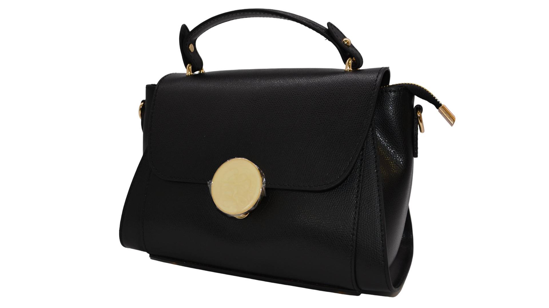 Umhängegurt (Leder) einhängbar, Überwurfpatte mit großem Permuttverschluss, innen mittig RB und innen seitl. RV-Tasche, ACC. Gold