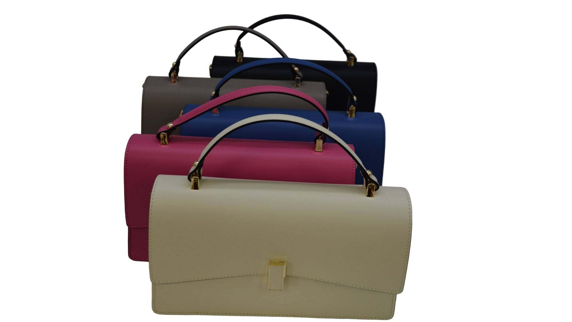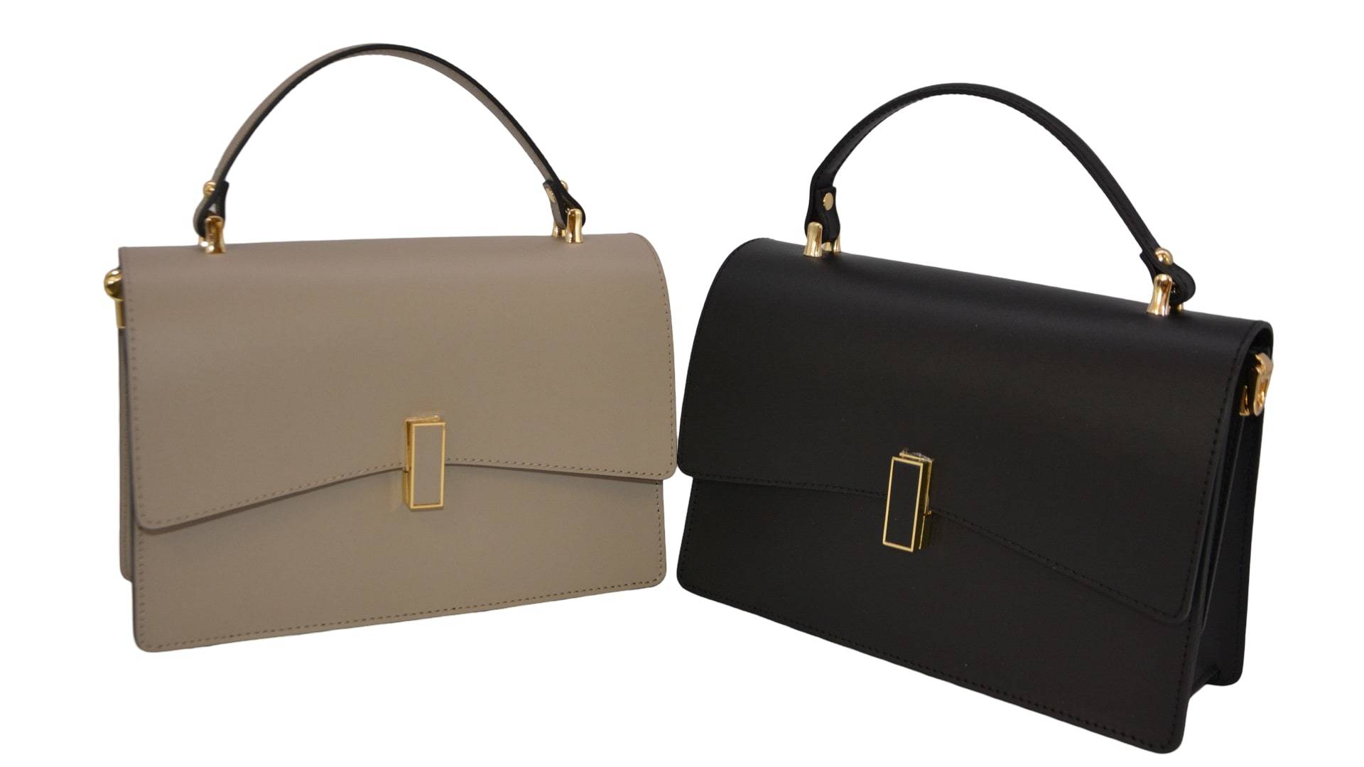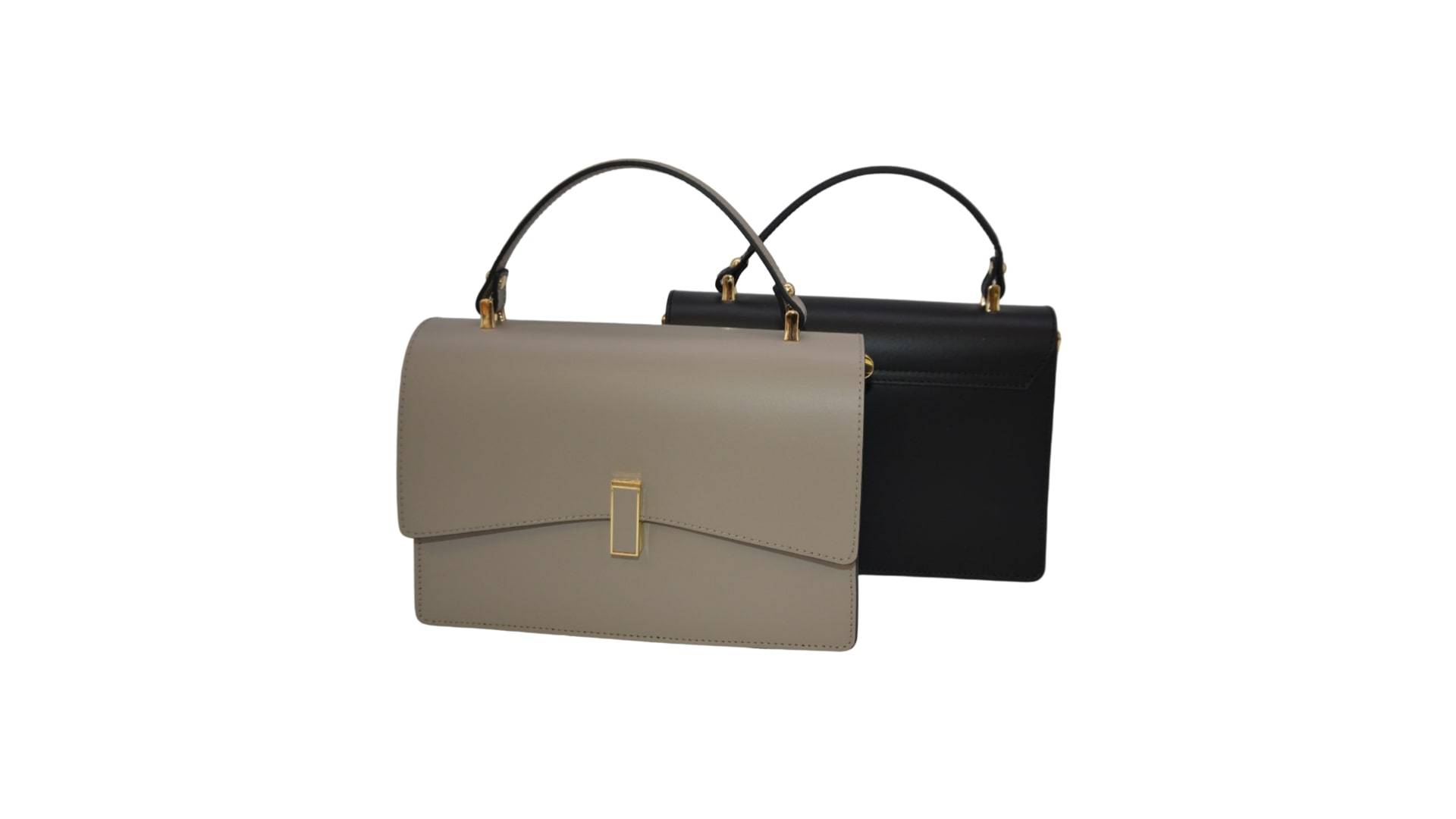 Tragegriff (Leder) auf Überwurfpatte, Drehverschluss, Mitteltaschenbeutel mit RV, am RT innen seitl. RV-Tasche und am VT innen seitl. Einschubtasche, Umhängegurt (Leder) einhängbar, Acc. Gold, innen Double-Face Lederoptik