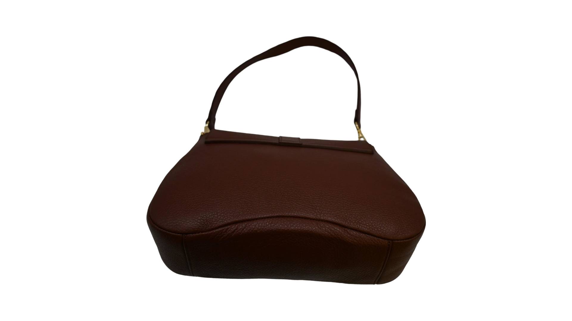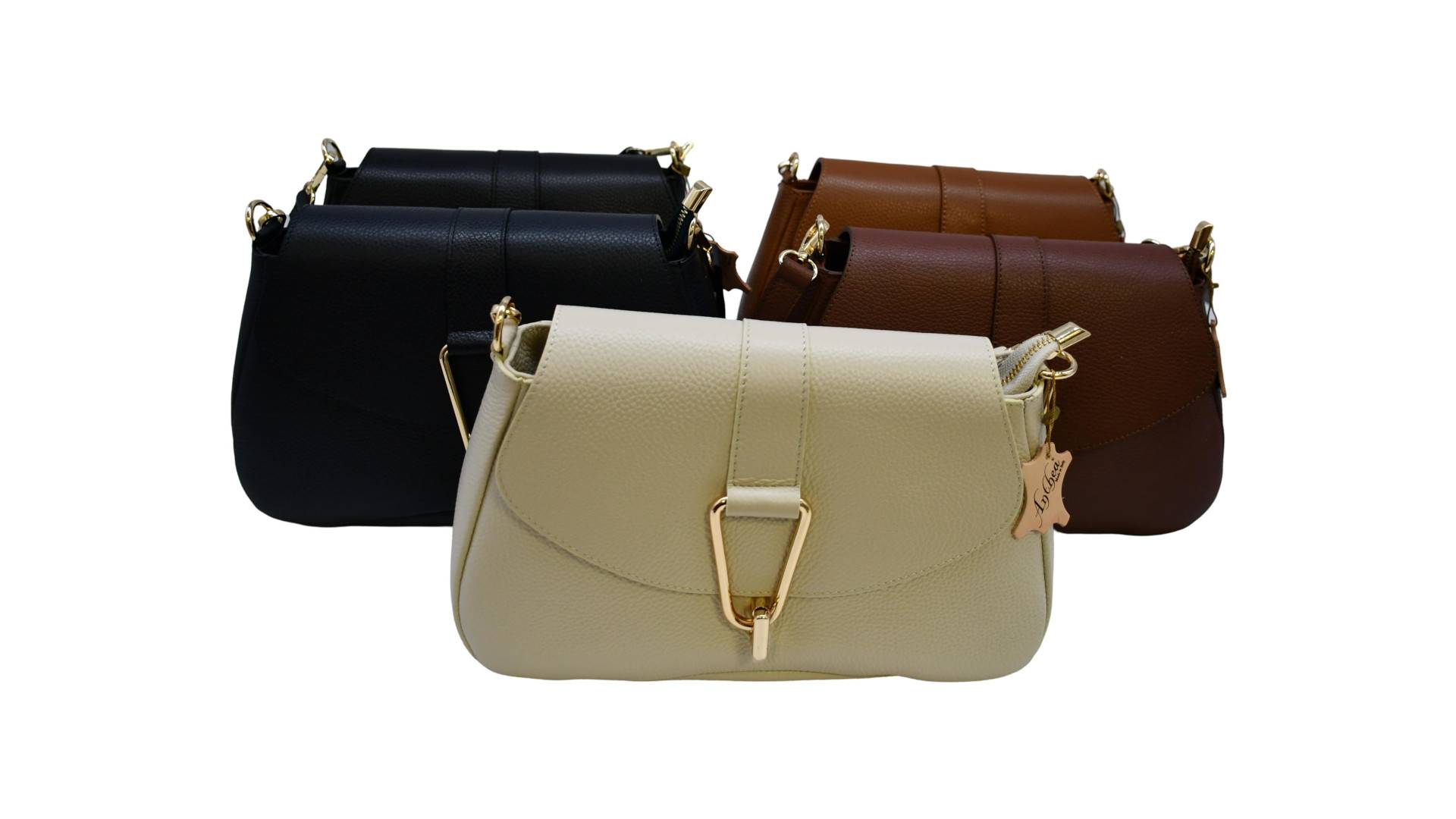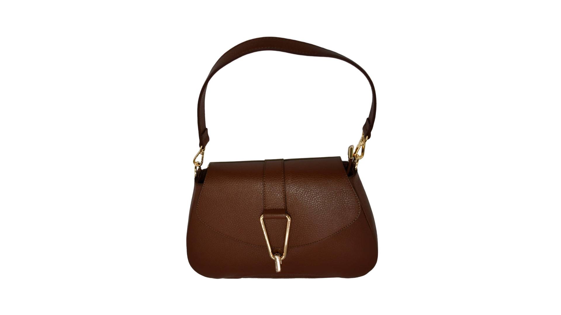kurzer Tragegurt einhängbar, Überwurfpatte, mittig RV, innen seitl. RV-Tasche und Einschubtasche, Umhängurt (Leder) eingängbar, Acc. gold