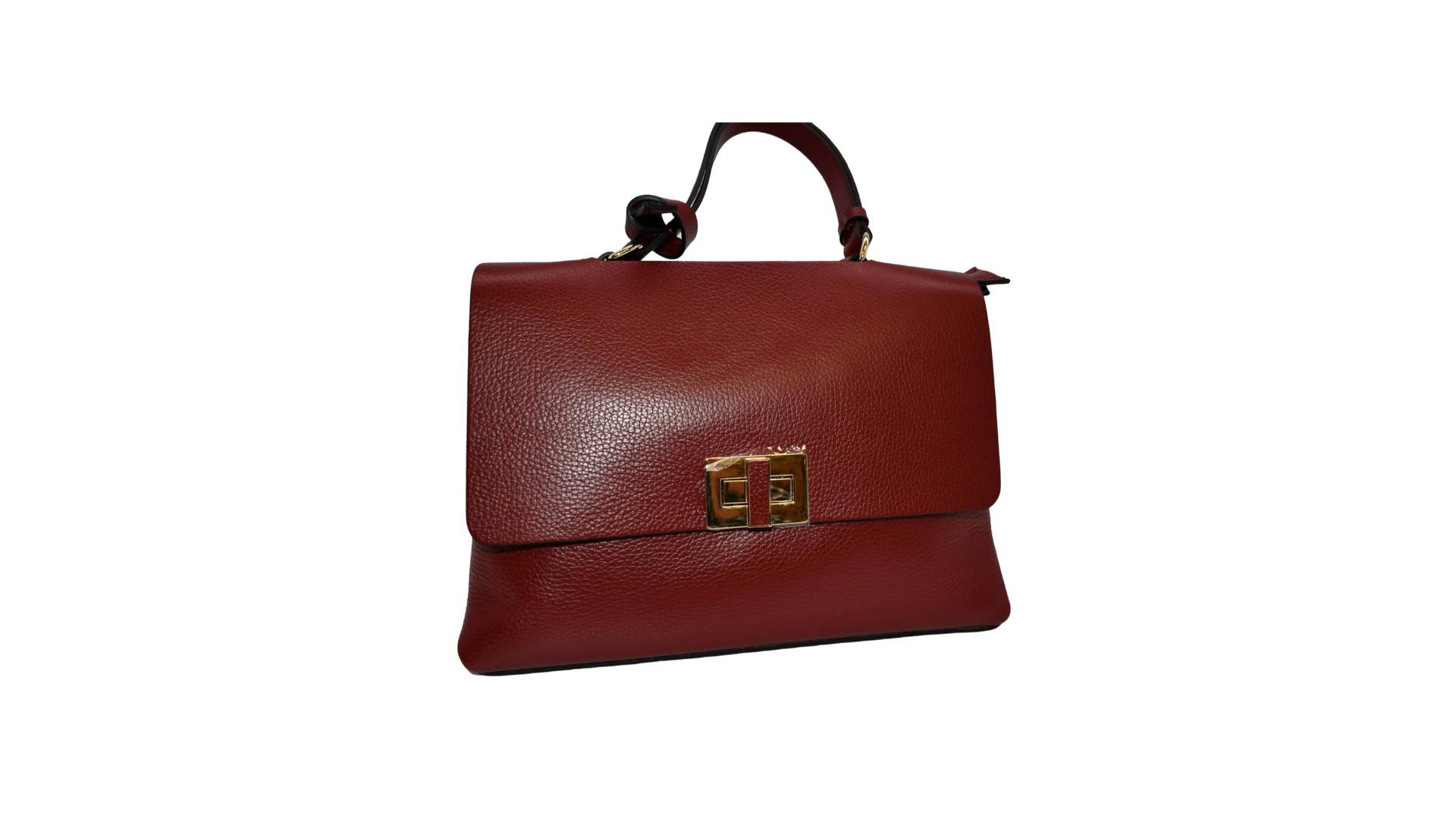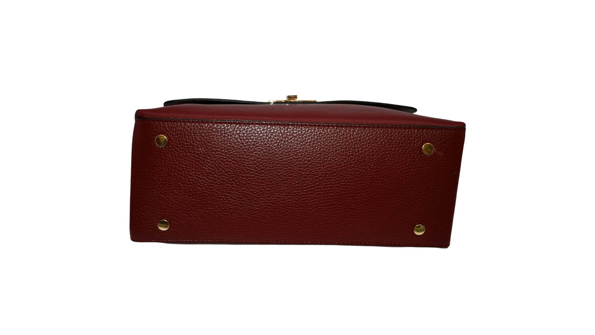 Tragegriff (Leder) an Überwurfpatte, mittig 2x Rv-Taschen, RT innen seitl. RV-Fach, VT innen Einschubfach, Umhängegurt (Leder) einhängbar, Innenfutter Synthetic,  Acc. gold