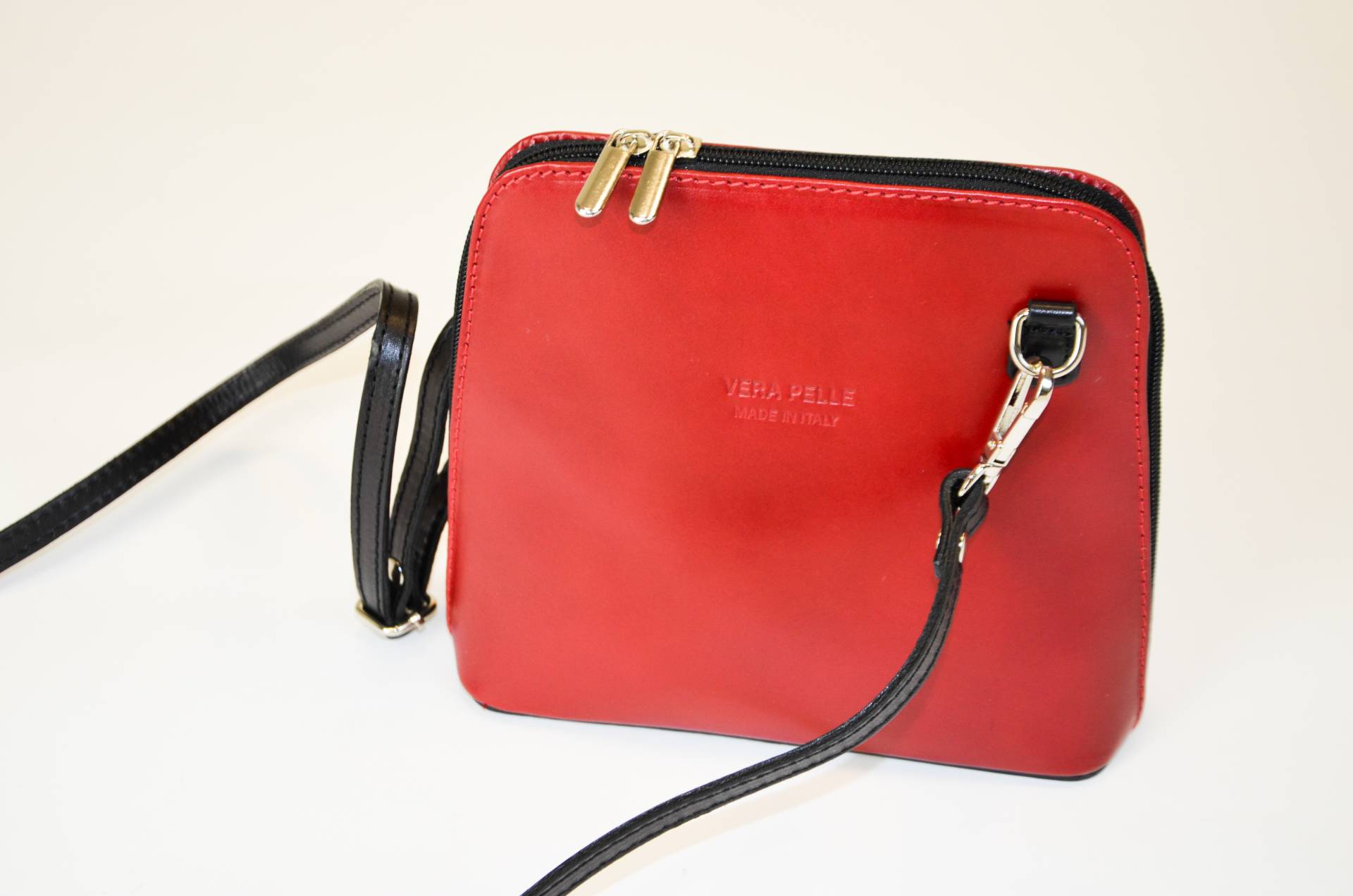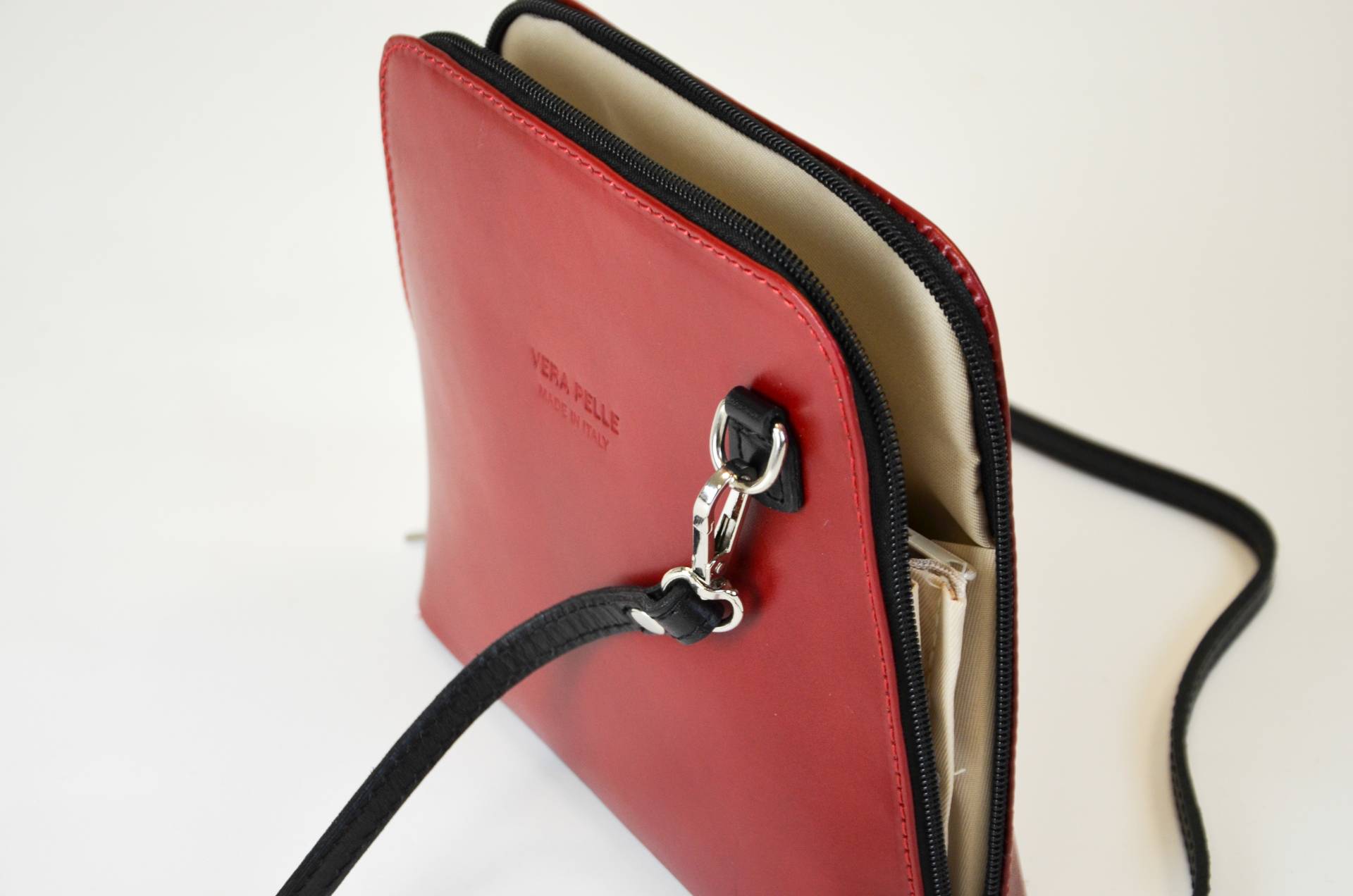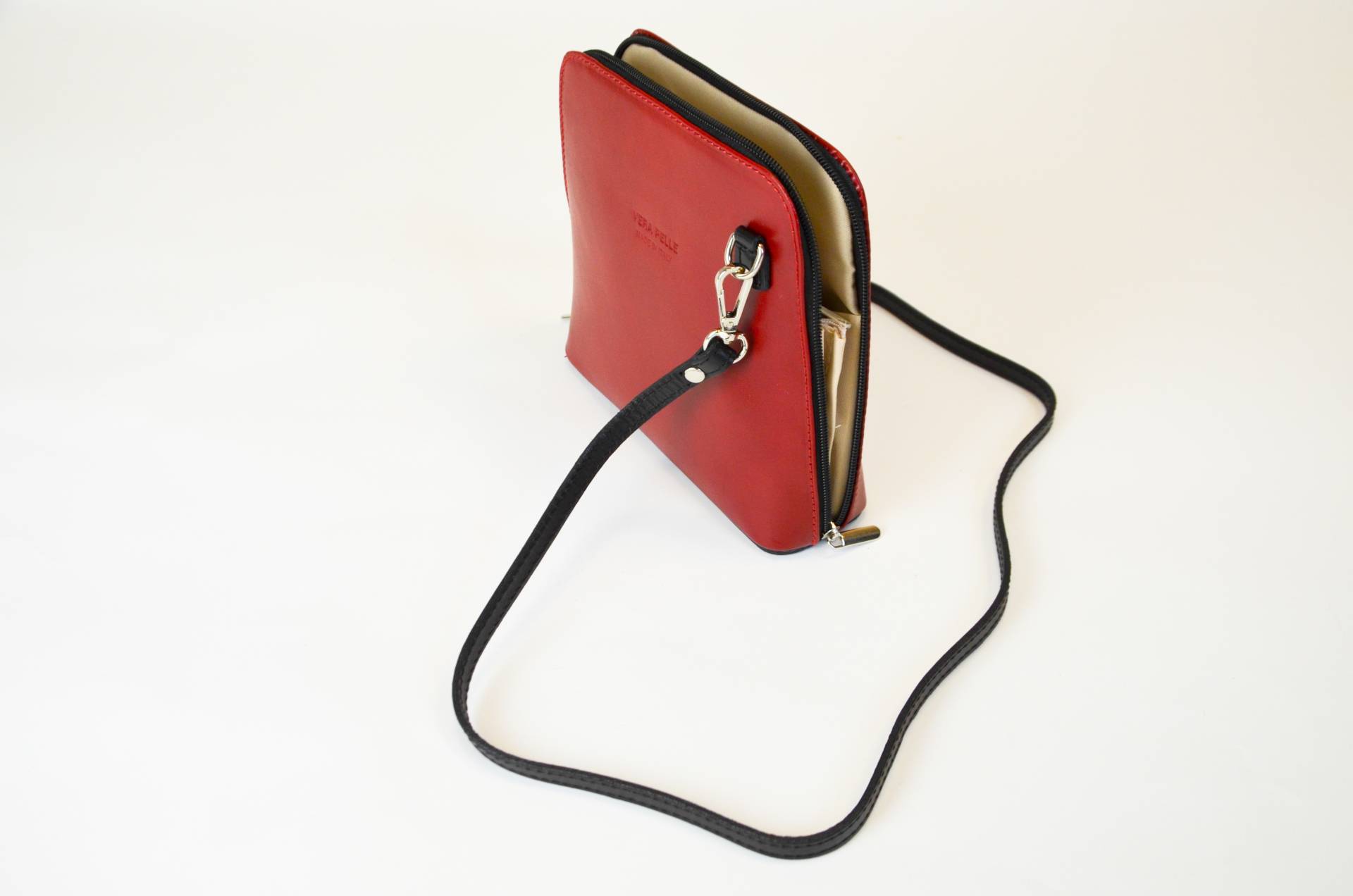 Kleine Umhängetasche, ECHTES LEDER / VERA PELLE / STYLED+MADE IN ITALY, Leder glatt, rot mit schwarzem Boden und Gurt, RV schwarz, rot mit schwarz, Länge ca. 22 cm, Weite ca. 7 cm, Höhe ca. 19 cm (ohne Henkel/Griffe), unverbindliche Preisempfehlung € 54,90 bis € 79,90 (Endverbraucherpreis)