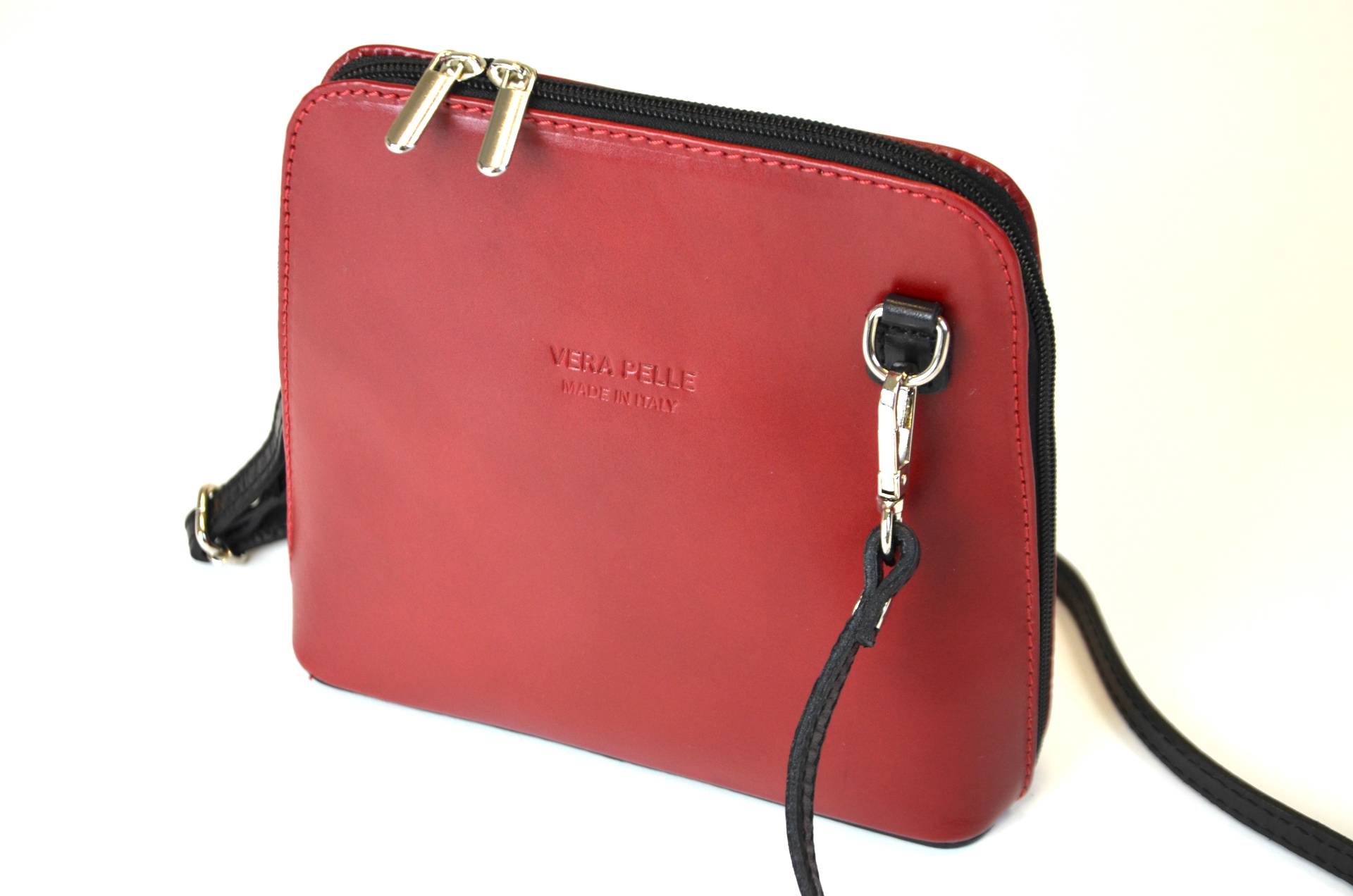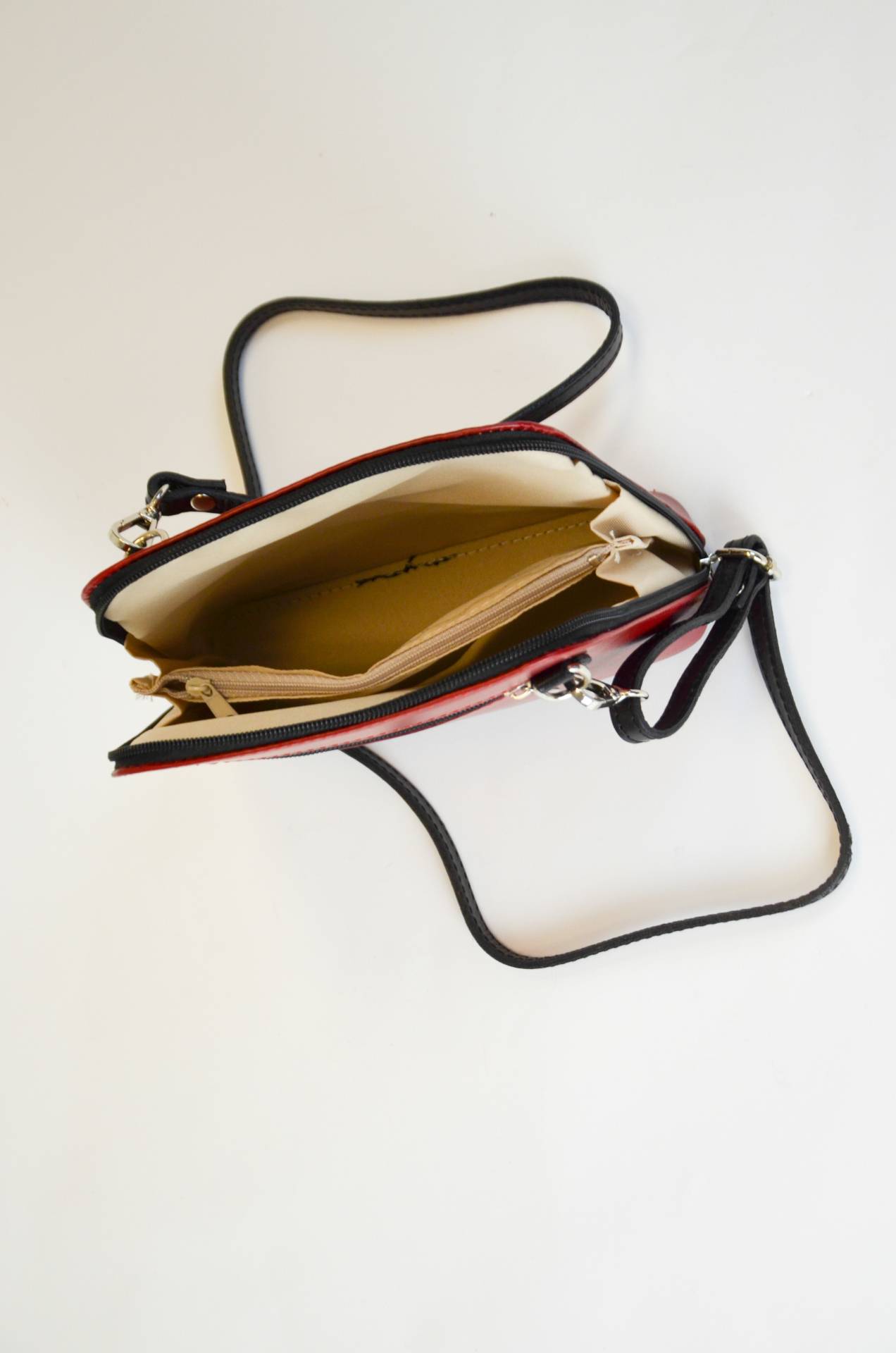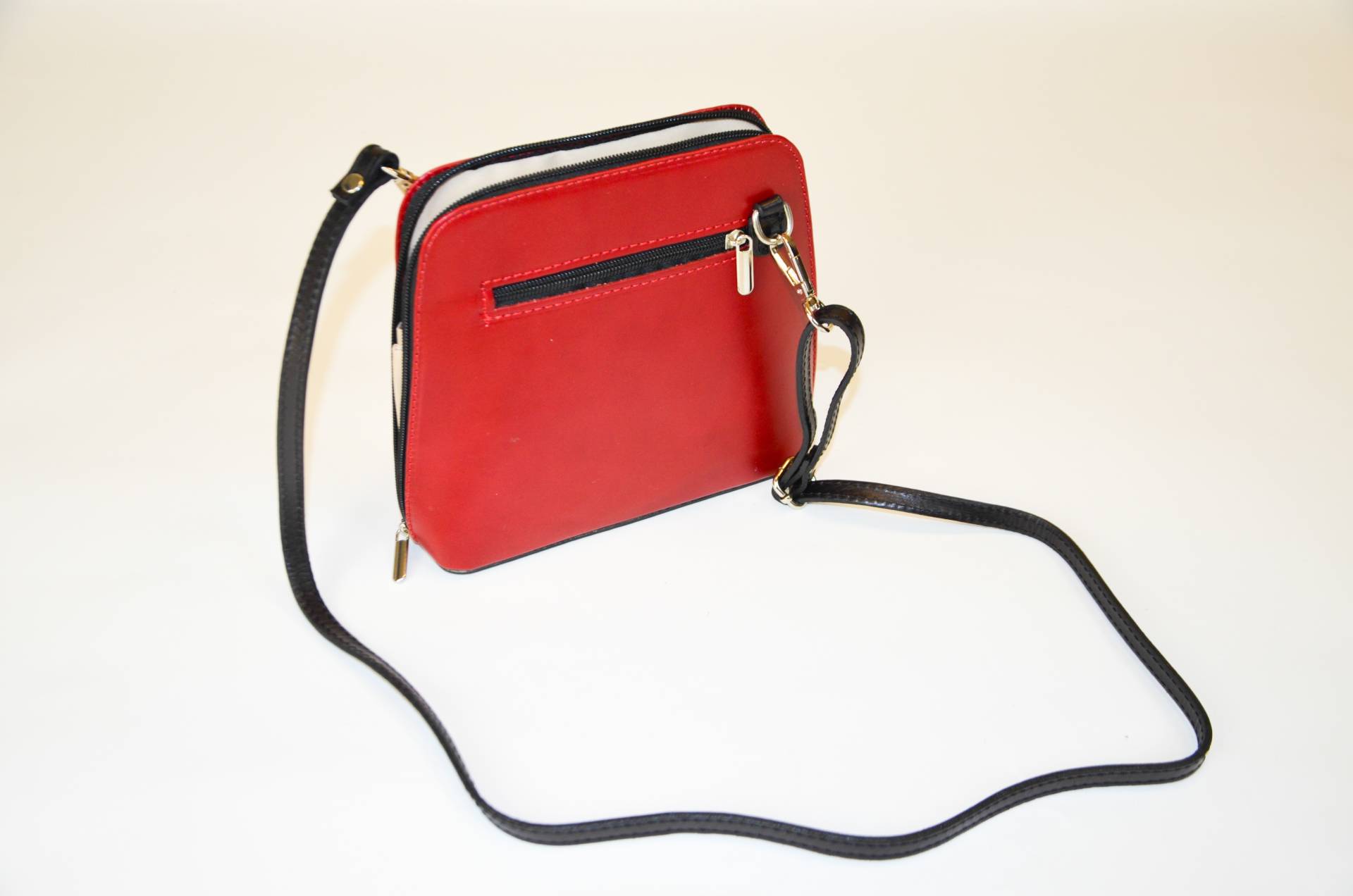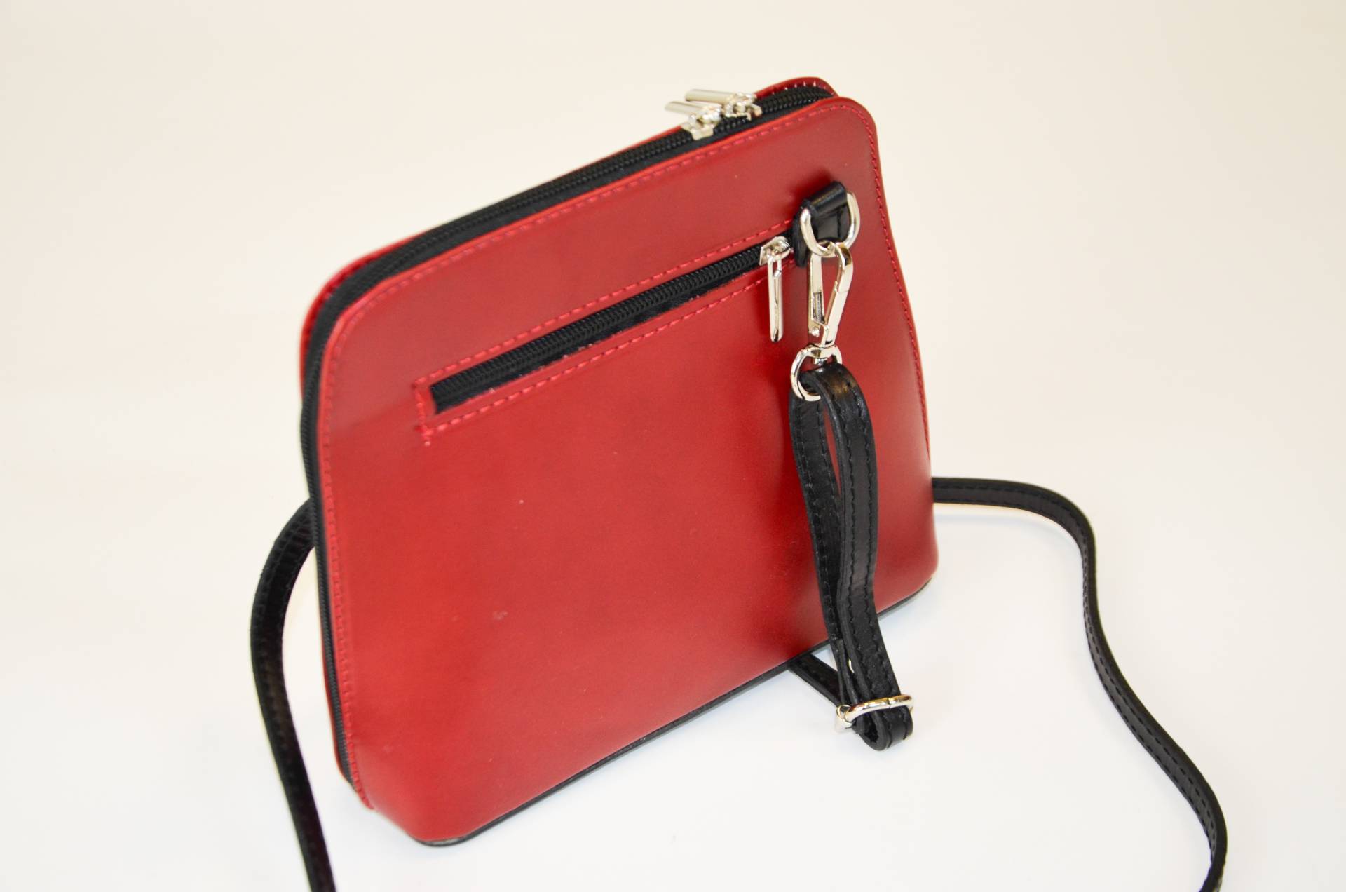 Kleine Umhängetasche, ECHTES LEDER / VERA PELLE / STYLED+MADE IN ITALY, Leder glatt, rot mit schwarzem Boden und Gurt, RV schwarz, rot mit schwarz, Länge ca. 22 cm, Weite ca. 7 cm, Höhe ca. 19 cm (ohne Henkel/Griffe), unverbindliche Preisempfehlung € 54,90 bis € 79,90 (Endverbraucherpreis)