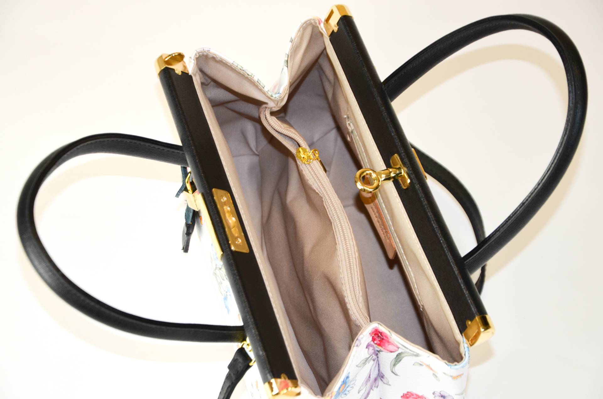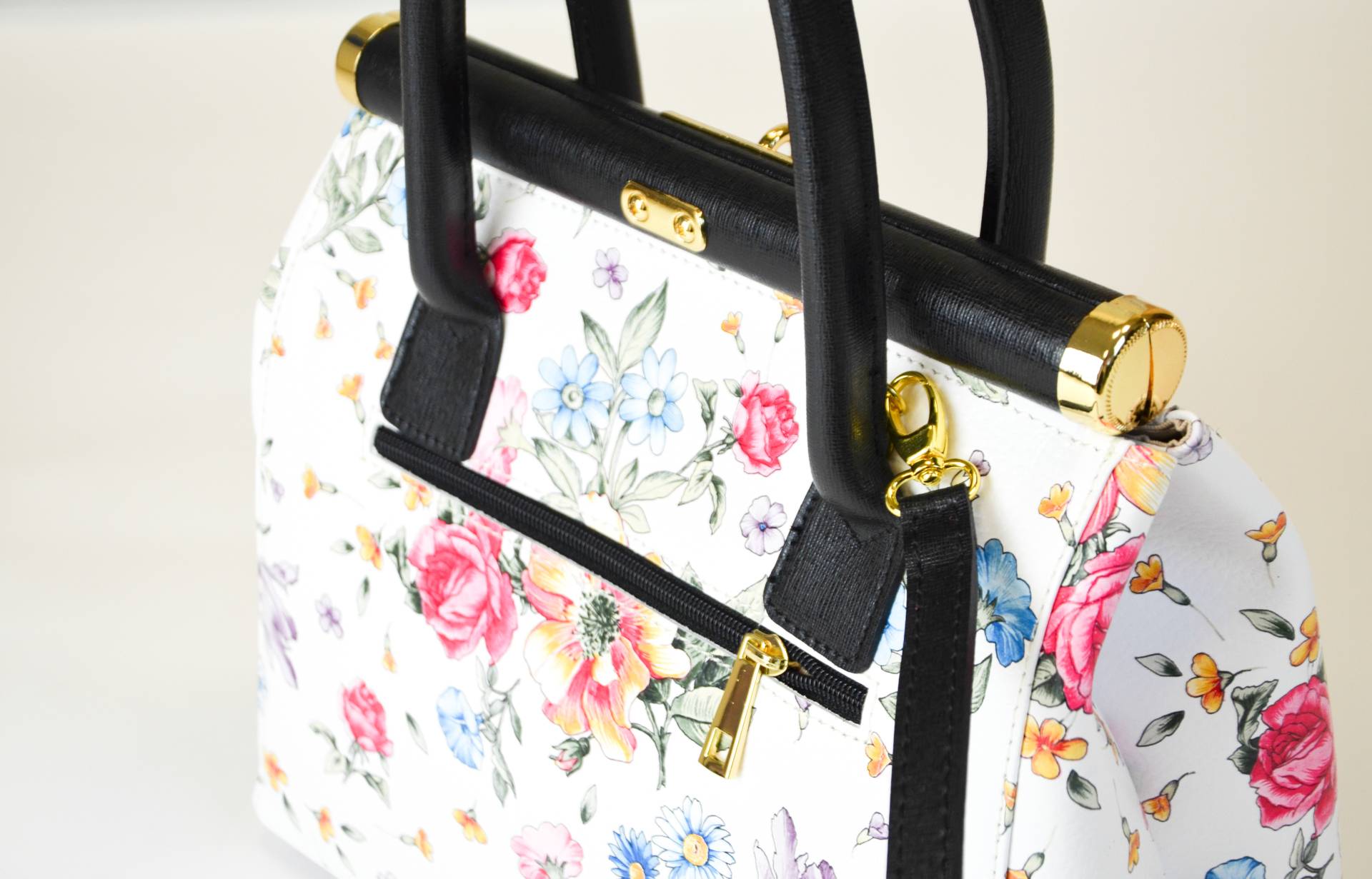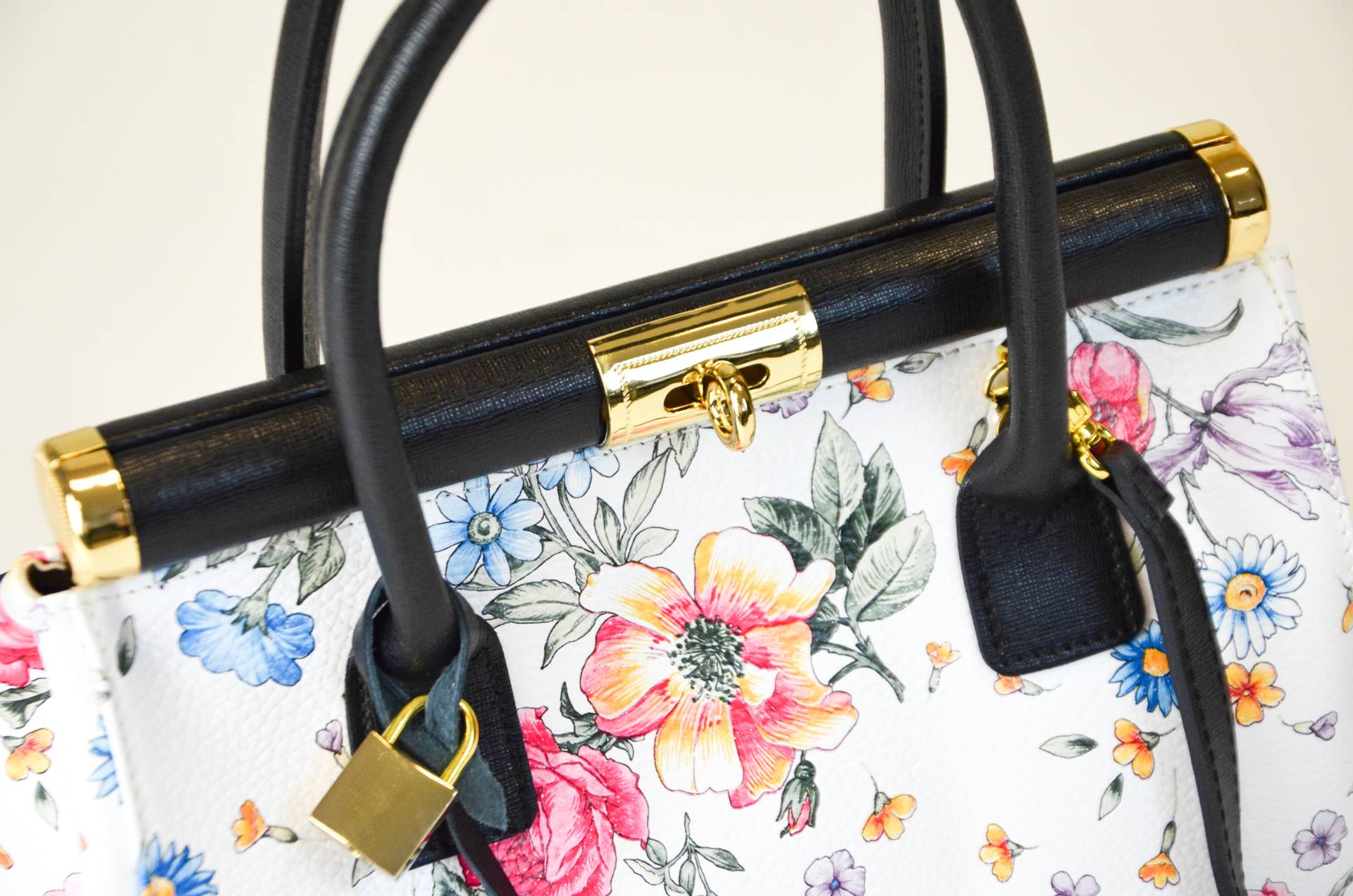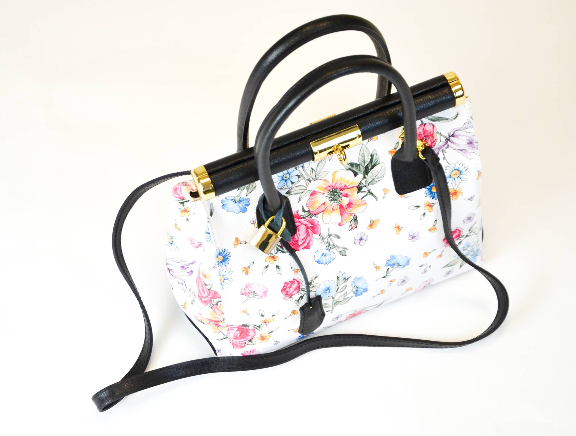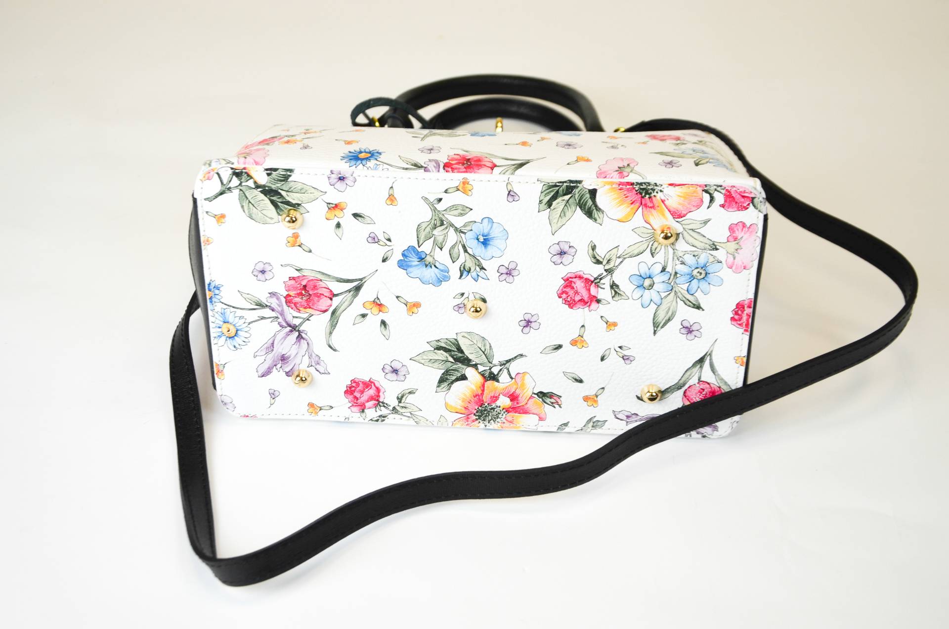 Hand- und Umhängetasche, ECHTES LEDER / VERA PELLE / STYLED+MADE IN ITALY, Leder Druck Blüten auf weissem, Fond, leichte Struktur, Druck auf weiss, Länge ca. 30 cm, Weite ca. 15 cm, Höhe ca. 26 cm (ohne Henkel/Griffe), unverbindliche Preisempfehlung € 99,90 bis € 149,90 (Endverbraucherpreis)