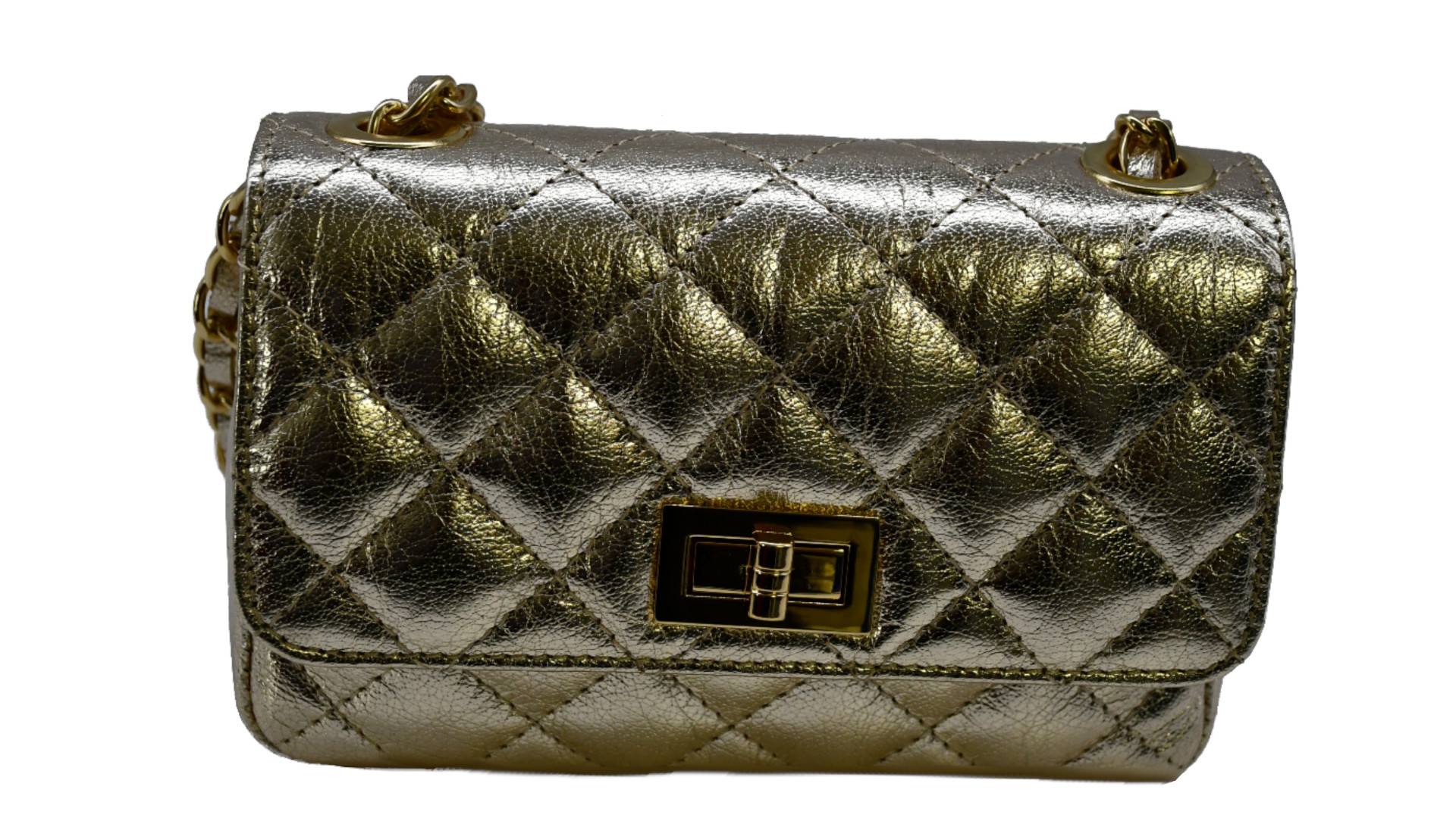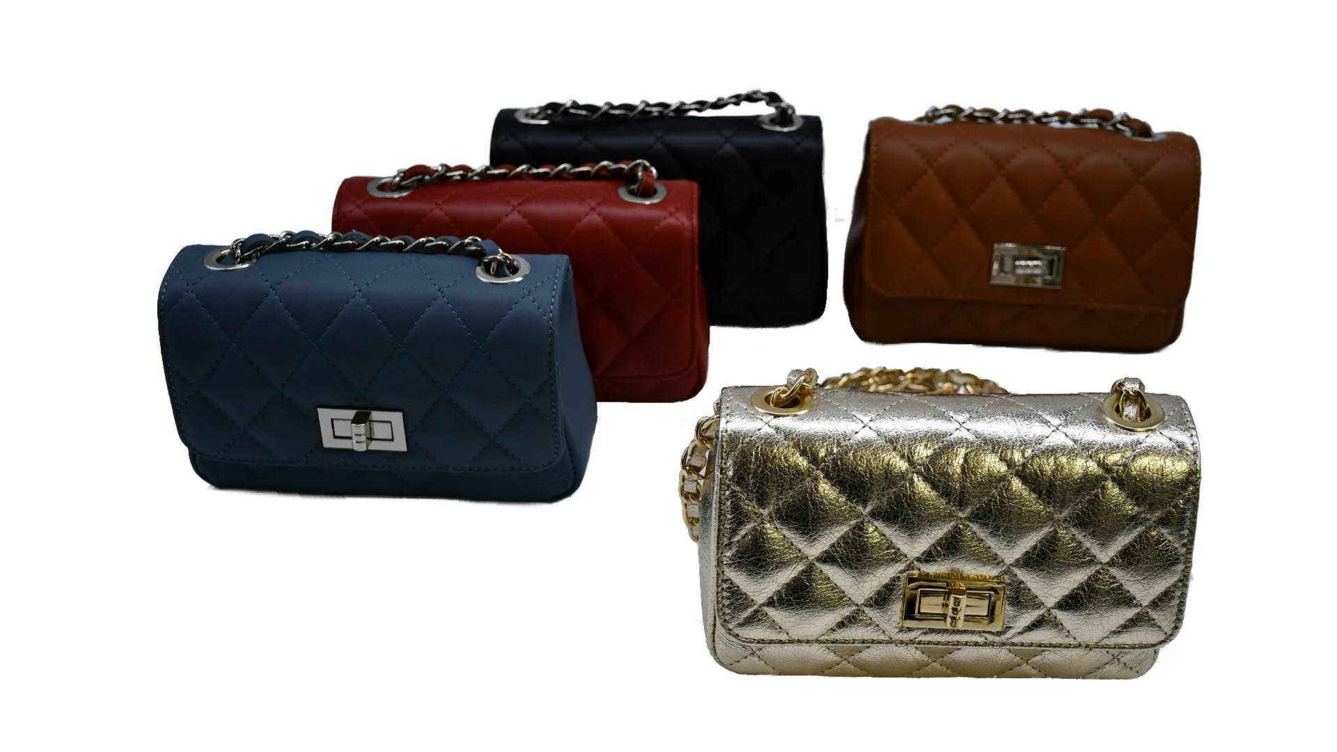 Kleine Umhängetasche, ECHTES LEDER / VERA PELLE / STYLED+MADE IN ITALY, L 20 x B 6 x H 14 (ohne Henkel/Griffe), Umhängejkette unt Leder durchzogen, Überwurfpatte mit Drehverschluss, innen seitl. RV-Tasche,  Acc. gold oder silber, unverbindliche Preisempfehlung € 59,90 bis € 89,00 (Endverbraucherpreis)