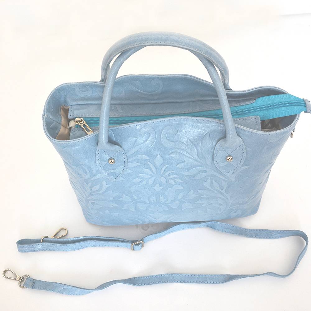 Mittelgroße Hand- und Umhängetasche, ECHTES LEDER / VERA PELLE / STYLED+MADE IN ITALY, Leder florales Prägemotiv (Ranken und Blätter), diverse, Länge ca. 31 cm, Weite ca. 13 cm, Höhe ca. 26 cm (ohne Henkel/Griffe), unverbindliche Preisempfehlung € 99,90 bis € 139,90 (Endverbraucherpreis)