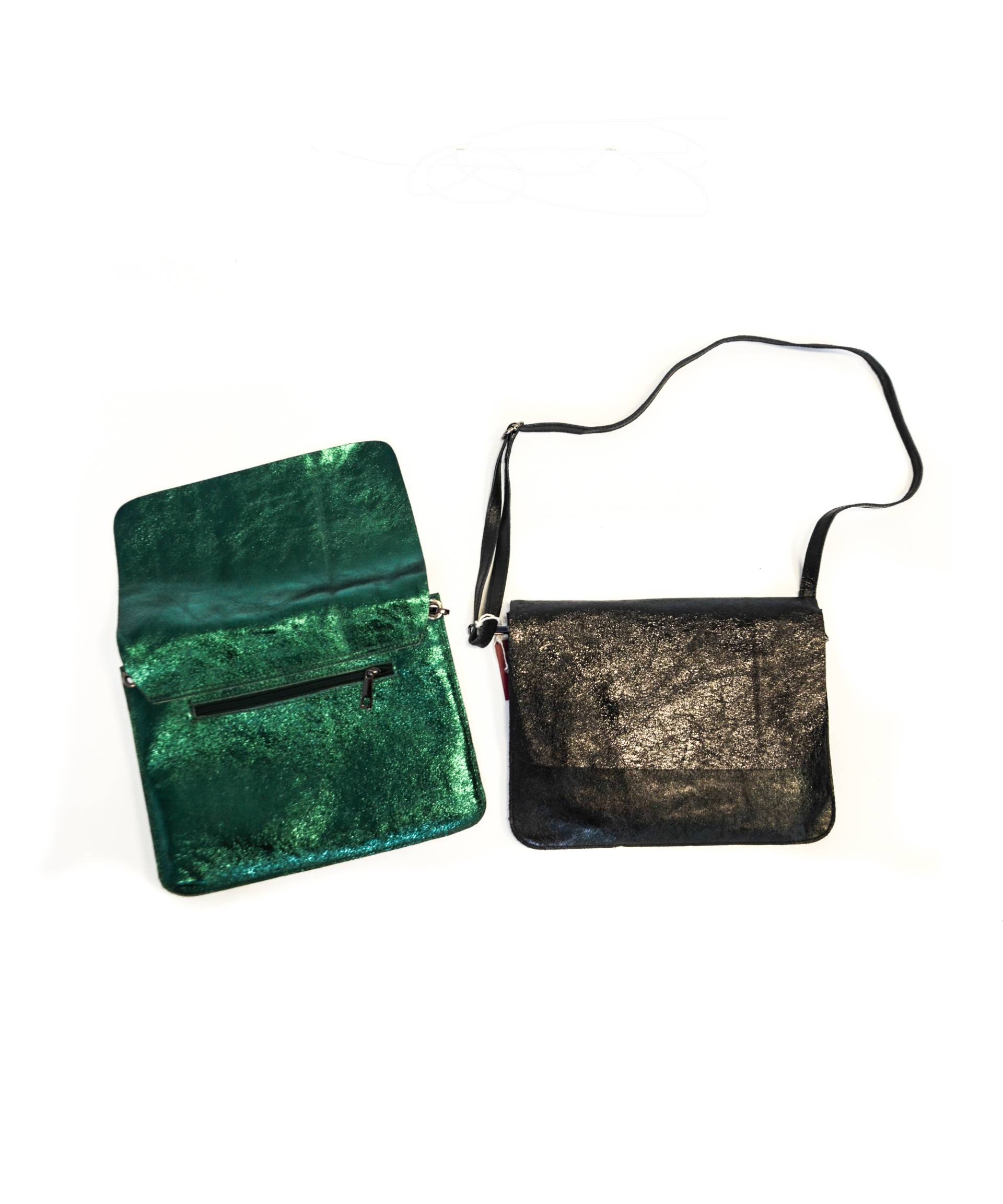 Mittelgroße Umhängetasche, ECHTES LEDER / VERA PELLE / STYLED+MADE IN ITALY, Leder, Metallic-Effekt, mittelgrün, schwarz, Länge ca. 29 cm, Weite ca. 1 cm, Höhe ca. 22 cm (ohne Henkel/Griffe), unverbindliche Preisempfehlung € 55,90 bis € 79,90 (Endverbraucherpreis)