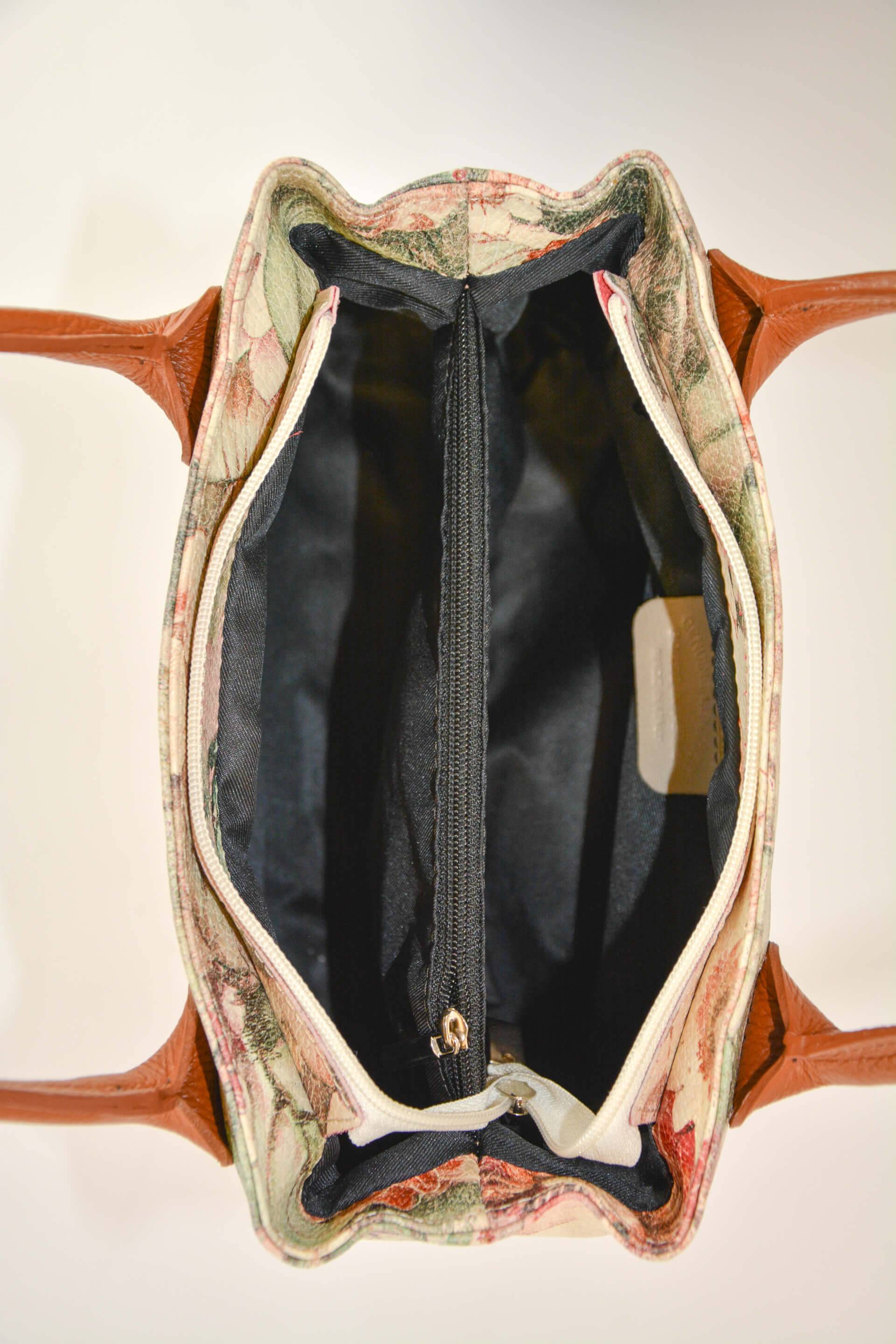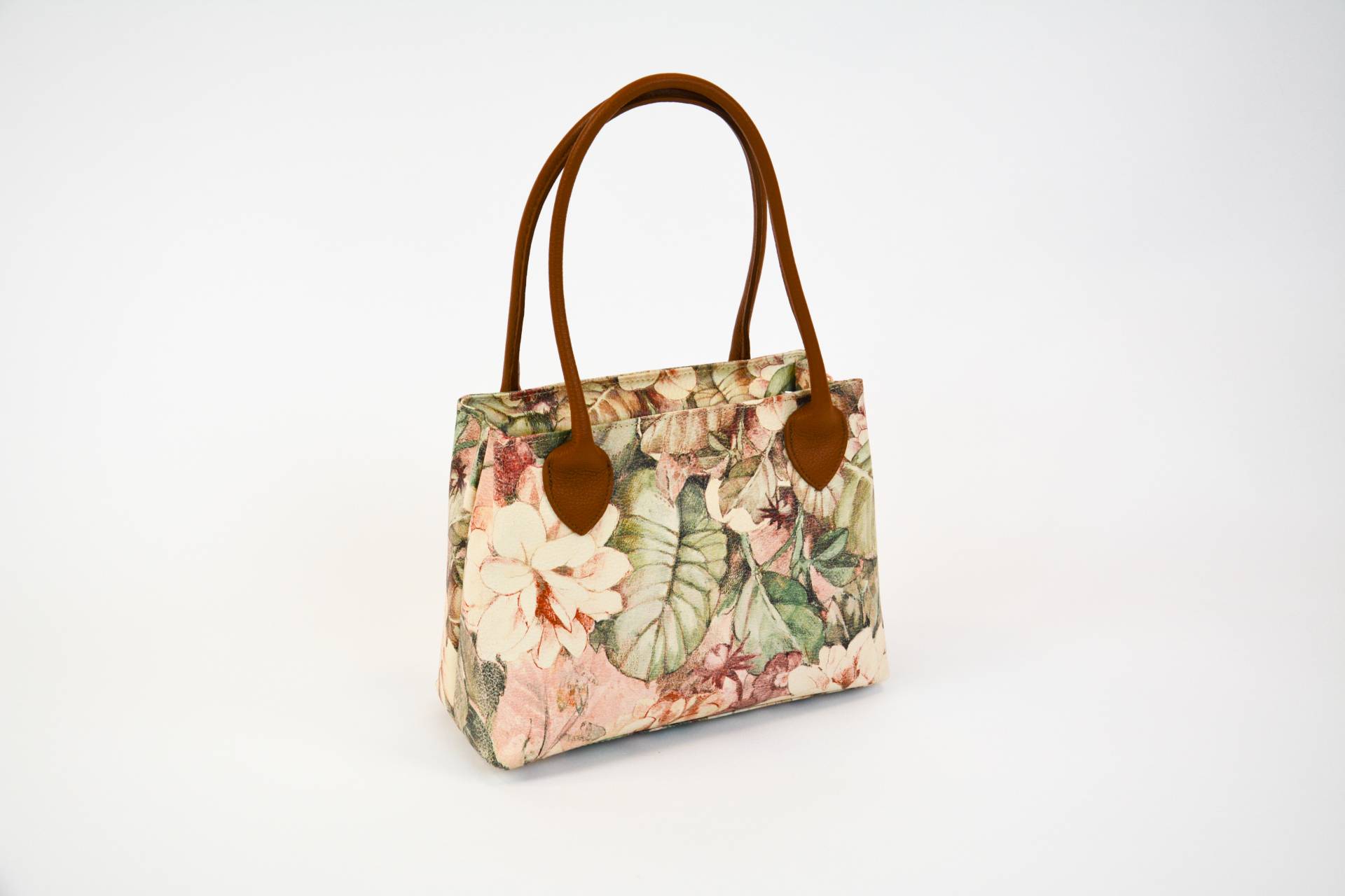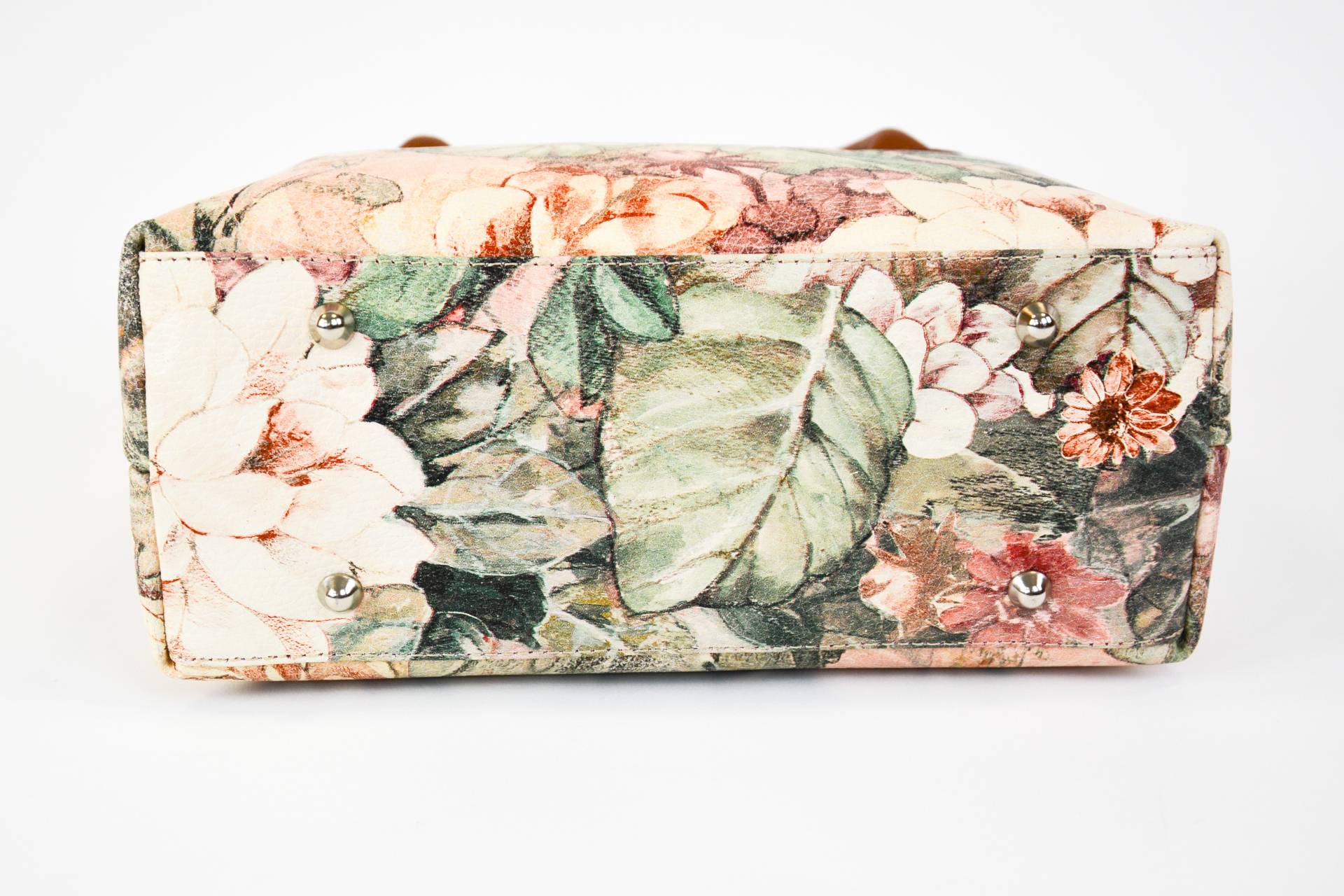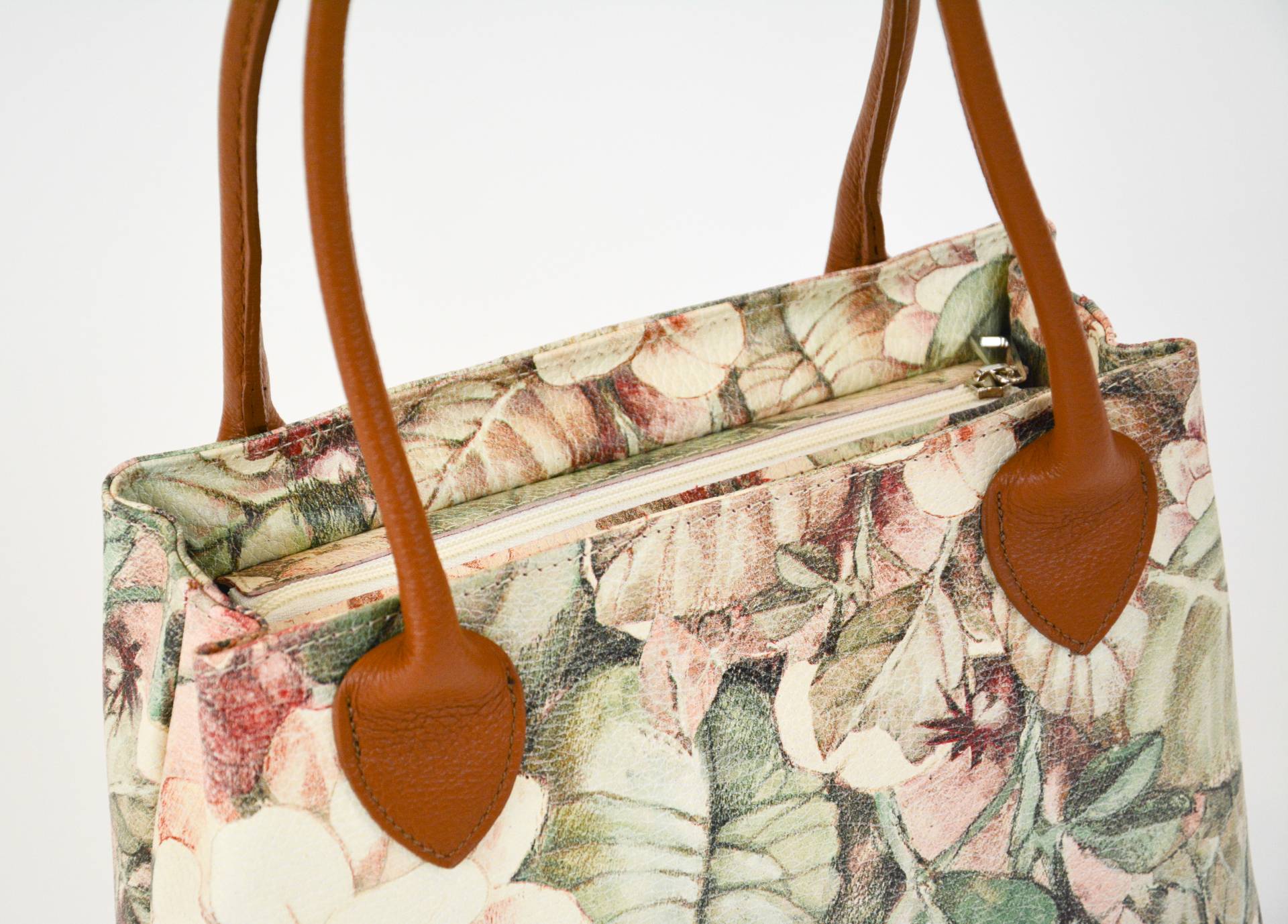 Handtasche, ECHTES LEDER / VERA PELLE / STYLED+MADE IN ITALY, "Gobelindruck", Blüten und Blätter, Tragegriffe und RV creme, floral, Blüten, Länge ca. 30 cm, Weite ca. 13 cm, Höhe ca. 22 cm (ohne Henkel/Griffe), unverbindliche Preisempfehlung € 99,90 bis € 139,90 (Endverbraucherpreis)